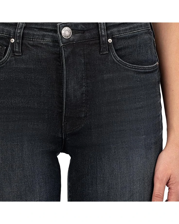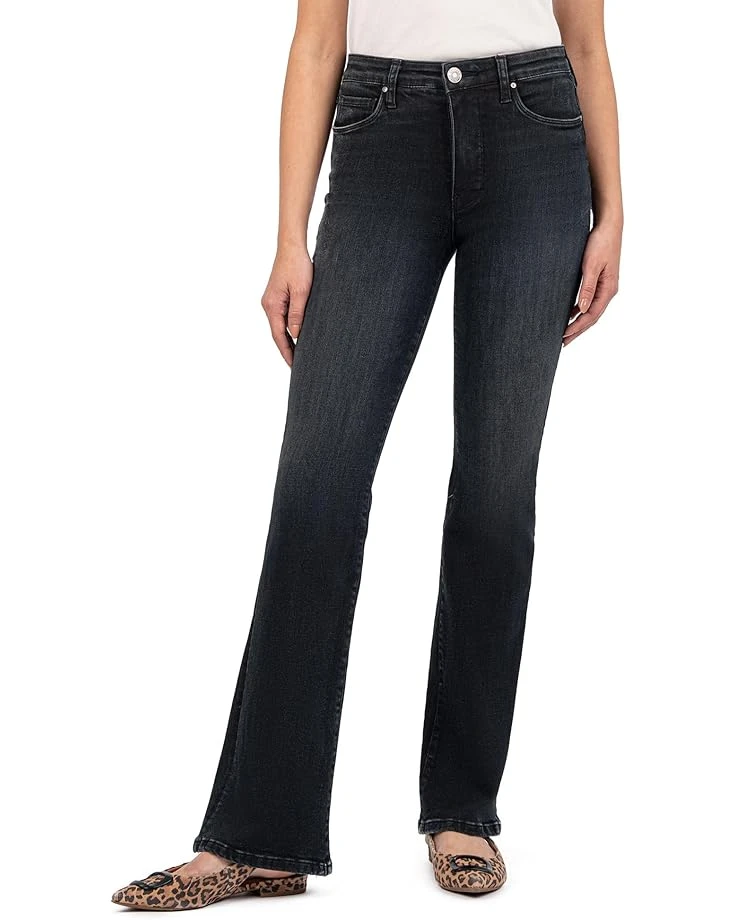 - Step into retro-inspired style donning the KUT from the Kloth™ Ana High-Rise Fab Ab Flare in Symphony-your ultimate blend of vintage charm and modern sophistication. Featuring a flattering high-rise and regular fit, these jeans offer a slim look through the legs that kicks just below the knee for the perfect flared silhouette. The pull-on design, zip-fly with button closure, five pockets, and belt loops ensure both comfort and function. Designed for taller figures, these flares pair effortlessly with sneakers for a trendy daytime look or can be dressed up for a chic night out.