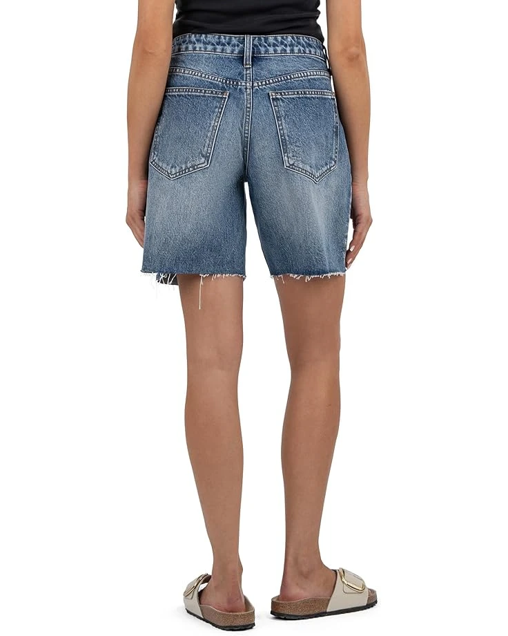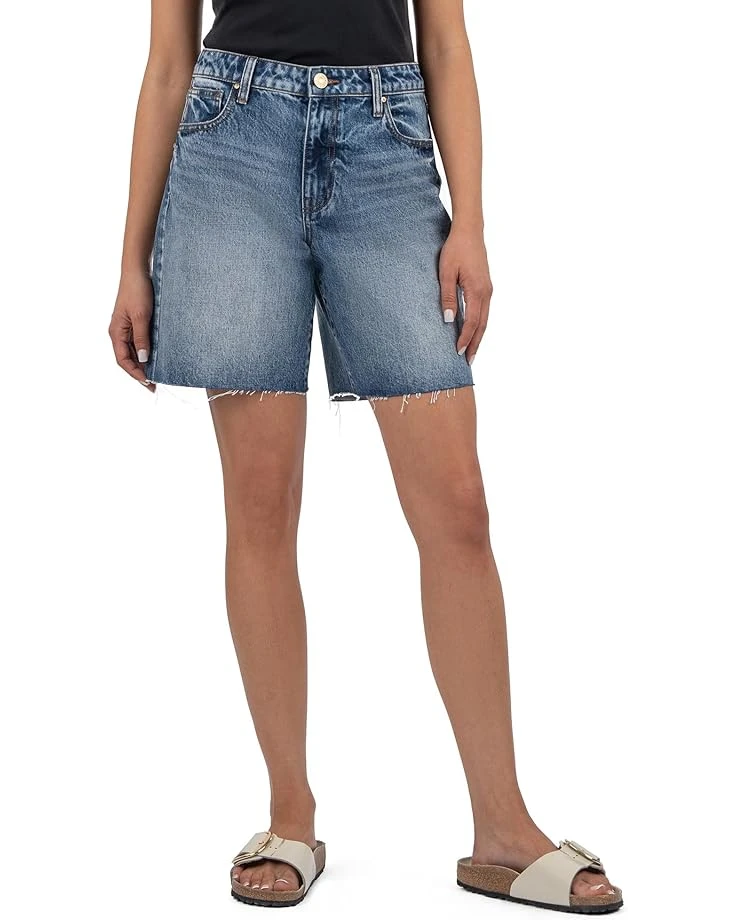 - Uncomplicated comfort: KUT from the Kloth™ Hailey High-Rise Bermuda-Basic Raw Hem shorts. Designed for comfort and style, these low-stretch denim shorts offer a relaxed, loose fit that moves with you. The pull-on ease, zip-fly with button closure, and belt loops provide a classic structure, while the five-pocket styling adds functionality. Featuring raw hems and distressed details for a touch of edgy charm, these Bermuda-length shorts are perfect for pairing with your favorite graphic tees or casual tops.