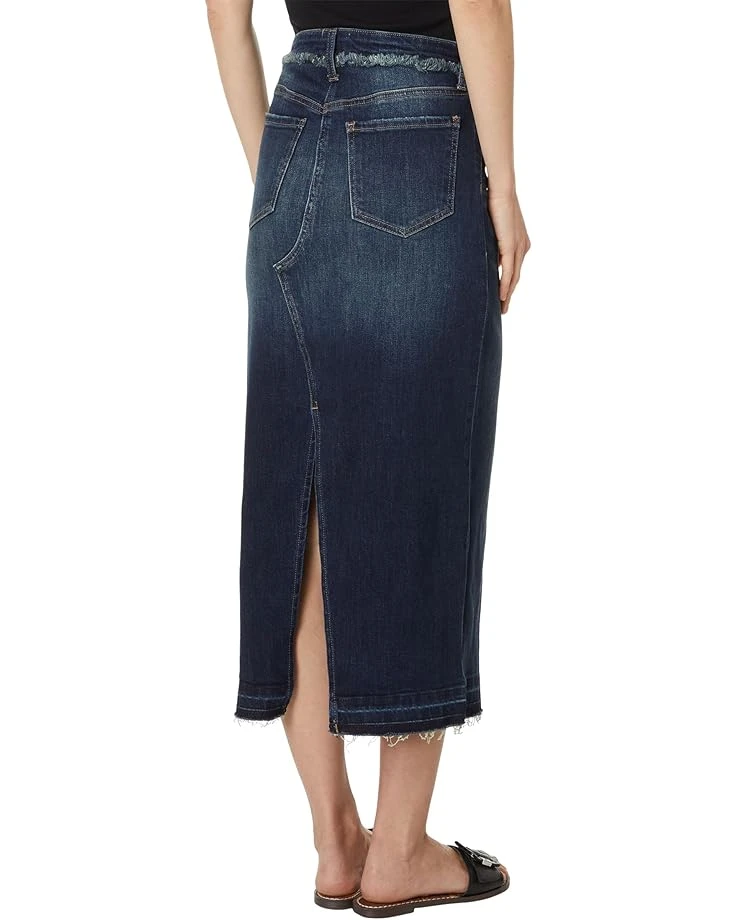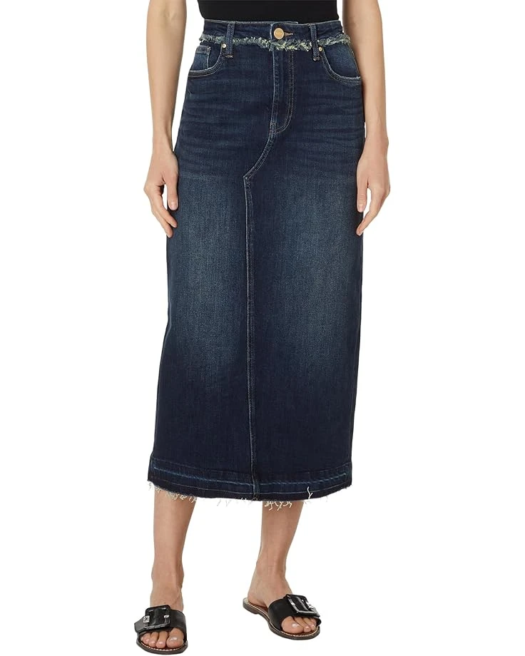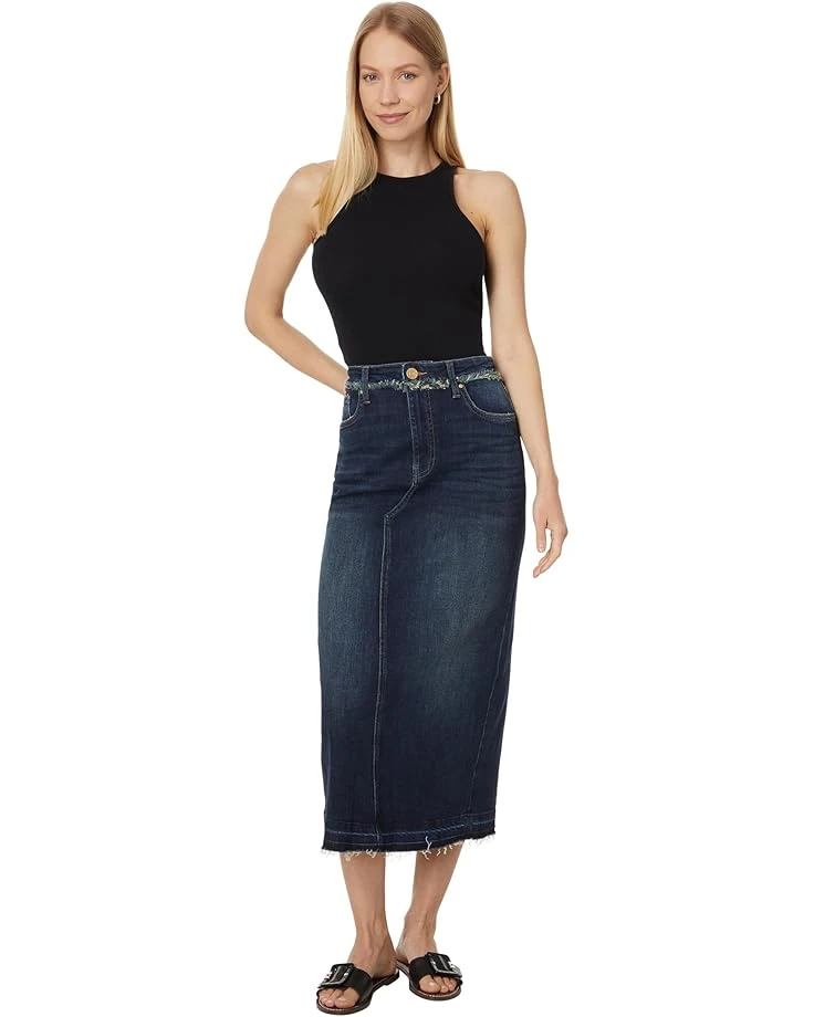 - Designed in a high-rise silhouette, the KUT from the Kloth™ Kelly Maxi Skirt is a great choice for creating fashionista looks and styles. The denim fabrication of this maxi-length skirt offers durability while the long slit at the center back ensures a better range of movement. One of the highlights of the skirt is its frill trim at the waist. A stylish addition to your wardrobe, this denim skirt is perfect to pair with casual tees and tops.