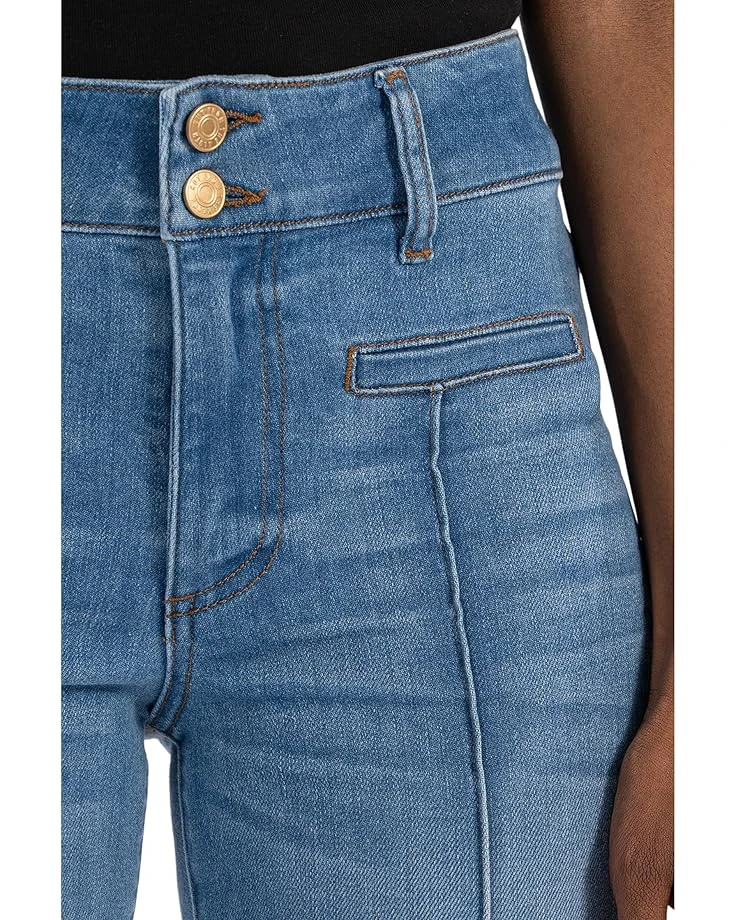 - The KUT from the Kloth™ Kelsey High-Rise Ankle Flare-Frt Welt-Double Button Wb striking silhouette and premium stretch denim make it a wardrobe essential. These jeans are figure-flattering and fashionable, designed with a regular fit, high-rise waist, and fitted through the hips and thighs. Featuring belt loops, zip-fly, and double-button closures, these jeans are a versatile addition to your wardrobe.