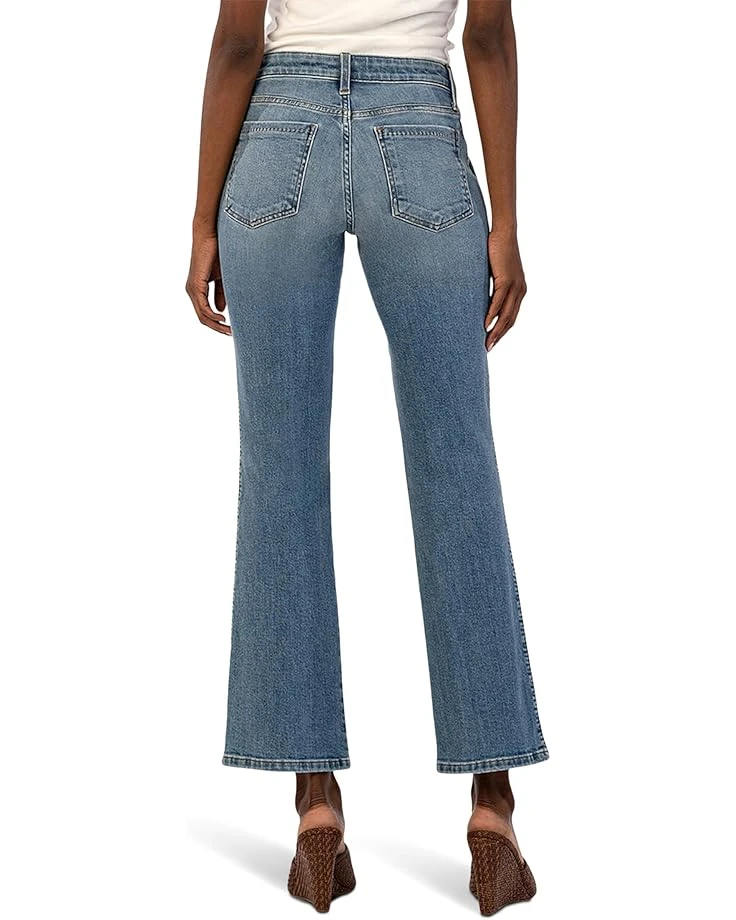 - Perfect for both casual and elevated looks, the Kelsey Mid Rise Ankle Flare Regular Hem Slash Pocket In Decreased jeans from KUT from the Kloth™ offers a versatile silhouette that effortlessly transitions from day to night. These ankle-length cropped jeans feature a trendy flare leg with a sleek mid-rise silhouette for a touch of aesthetic charm.