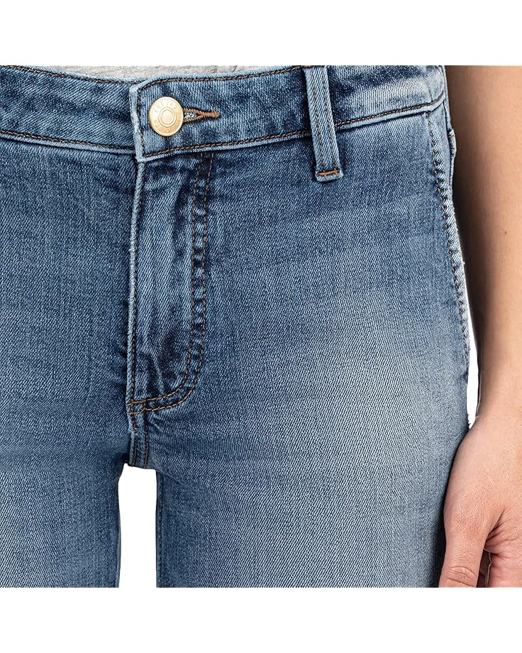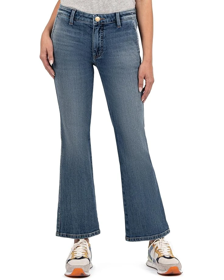 - Step up style and versatility wearing the KUT from the Kloth™ Kelsey Mid Rise Ankle Flare Regular Hem Slash Pocket Jeans. The pull-on style jeans features a mid-rise waist with belt loops, a zip-fly & button closure, two slash pockets on the front, two patch pockets on the back, and a flared leg style with regular hem.