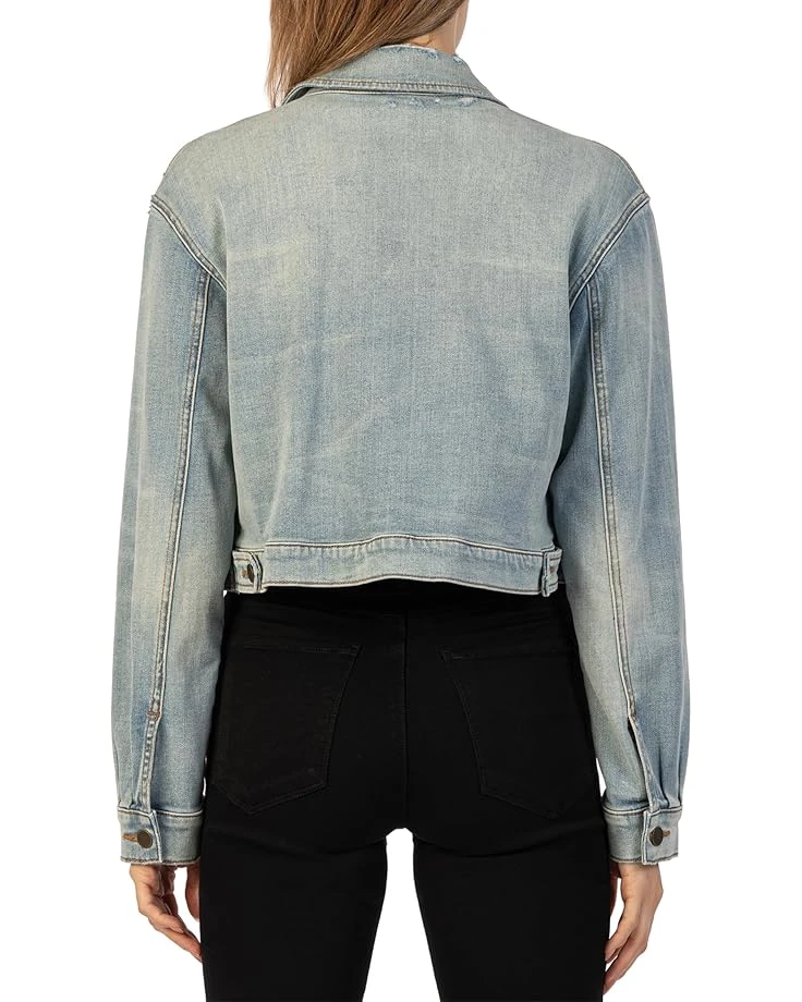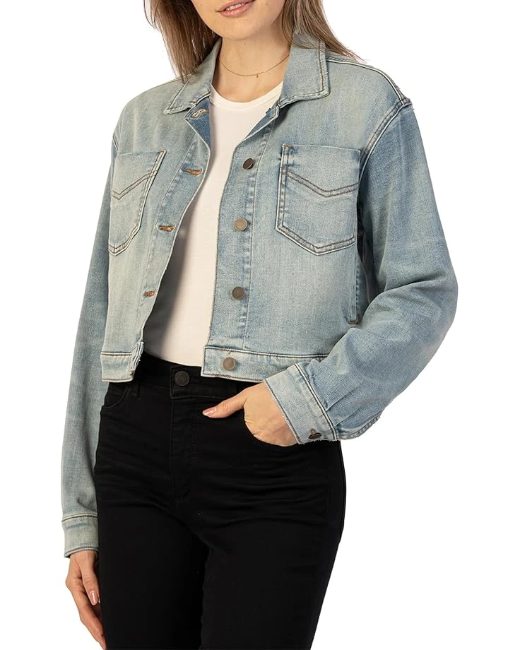 - Unleash your urban chic styling the KUT from the Kloth™ Lara Crop Jacket, a stylish fusion of modern edge and timeless comfort. Featuring a drop shoulder-patch front pocket and button-down closure, its long sleeves with buttoned cuffs and collared neck ensure effortless versatility and on-trend appeal.