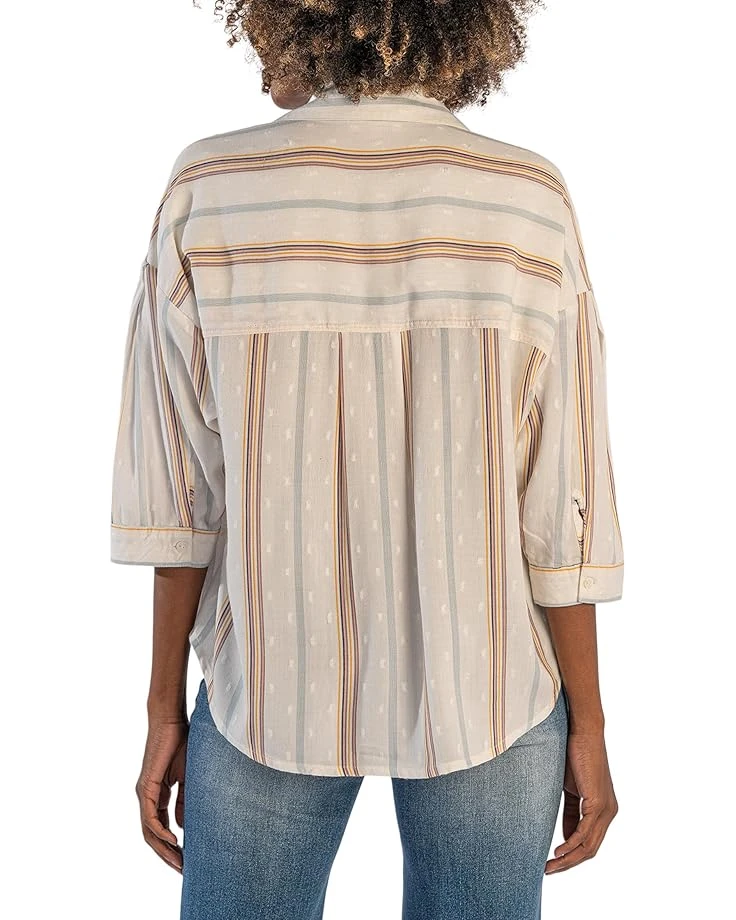 - The KUT from the Kloth™ Zuma – Drop Shoulder Crop Button Down exudes class and luxury while providing maximum comfort. It features two patch pockets on the chest front, three-quarter sleeves, and button front closure.